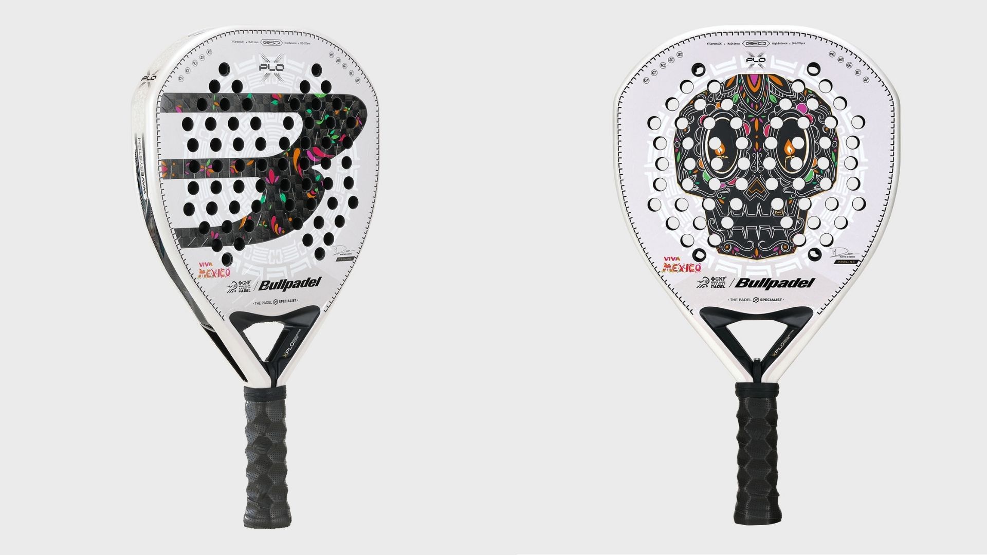 La XPLO MX LTD rinde homenaje al arte y la tradición del Día de Muertos, presentando un diseño impactante en el que una calavera mexicana ocupa el centro de la composición. Sobre una base blanca perlada, los detalles en colores vivos —rosas, verdes, naranjas y dorados— crean un contraste vibrante que refleja la alegría, el color y la profundidad simbólica de esta festividad icónica. Las líneas ornamentales que recorren la pala evocan los patrones del arte popular, aportando textura y dinamismo visual. El gran logotipo Bullpadel se integra con elegancia en el conjunto, reforzando la identidad de la marca dentro de una propuesta estética que combina modernidad, tradición y respeto por la cultura mexicana. Al igual que toda la colección, incluye la firma de Martín Di Nenno y la leyenda “VIVA MÉXICO”, símbolo de orgullo y autenticidad.