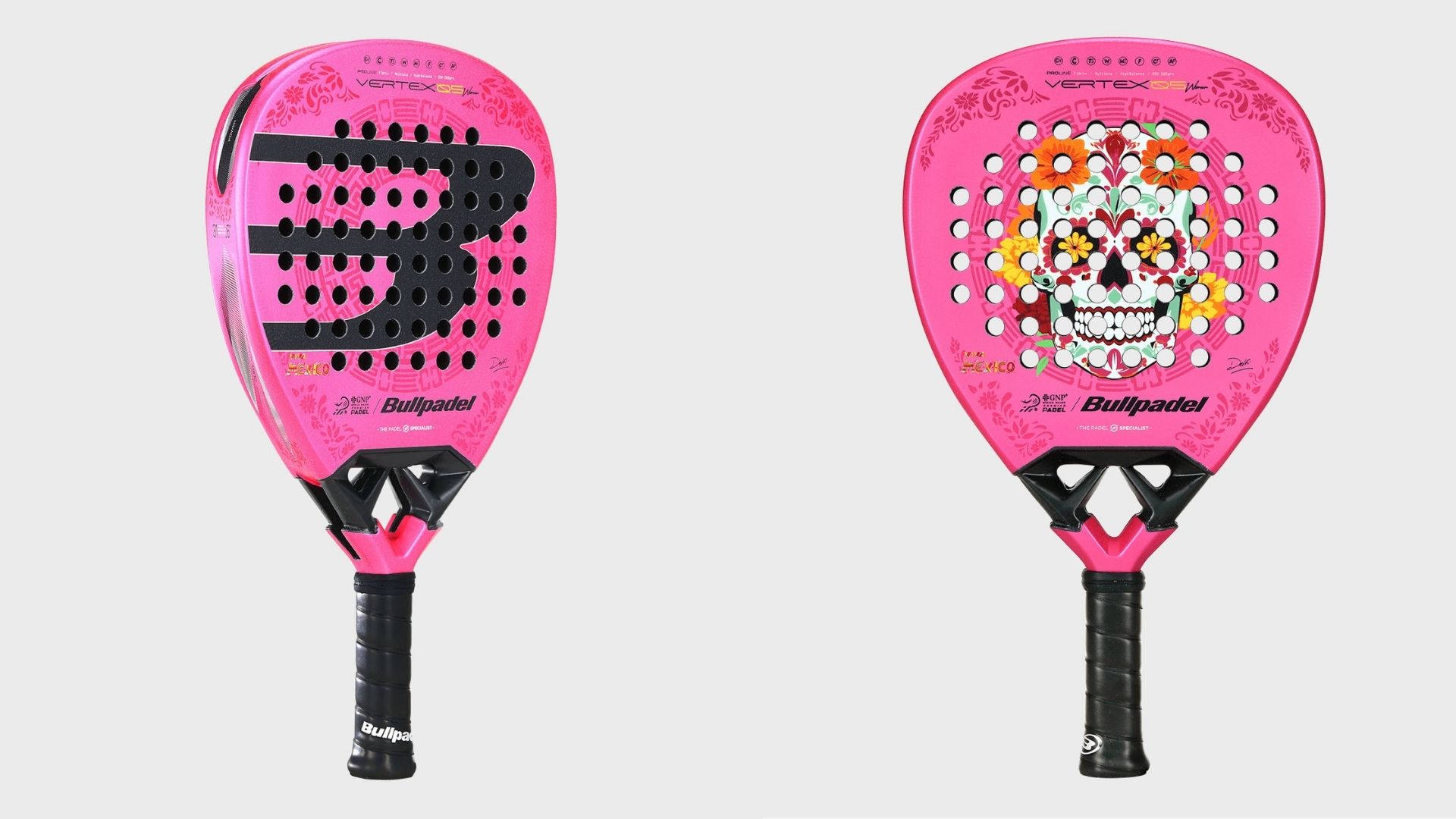 La Vertex 05 W MX LTD celebra la fuerza, la alegría y el color de México con un diseño vibrante que combina el arte tradicional con la innovación técnica característica de Bullpadel. Su tono rosa intenso simboliza la vitalidad, la energía y la determinación de las jugadoras que dejan su huella dentro y fuera de la pista.