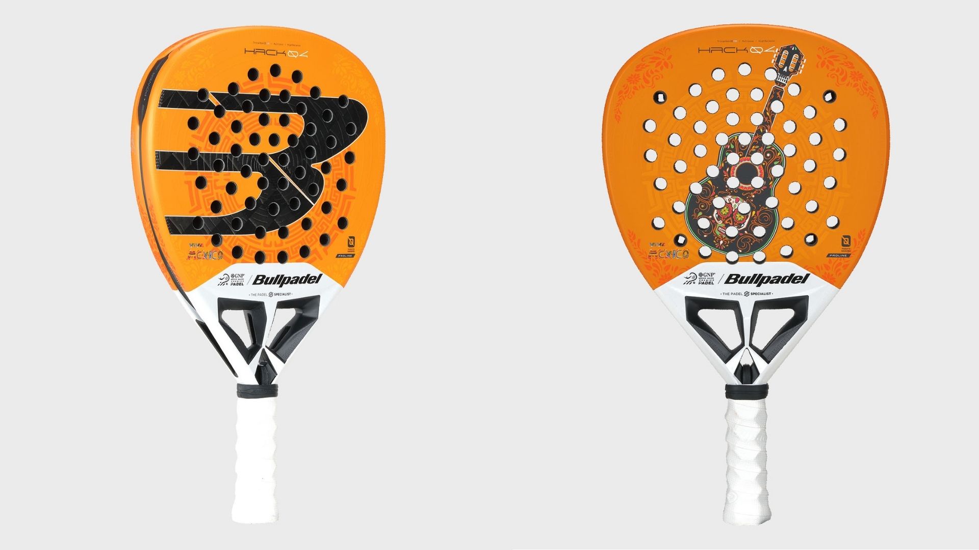 La Hack 04 MX LTD destaca por un diseño vibrante y lleno de carácter, en el que el color naranja intenso se convierte en protagonista, evocando la calidez y vitalidad de la cultura mexicana. En su superficie resalta una guitarra ornamental inspirada en el arte popular, símbolo de tradición, música y pasión, elementos profundamente arraigados en la identidad de México. Los detalles florales y los contrastes en negro y dorado aportan profundidad y elegancia, mientras que el logotipo Bullpadel en gran formato mantiene el equilibrio entre innovación y herencia. Como sello distintivo de la colección, incorpora la firma de Paquito Navarro y la inscripción “VIVA MÉXICO”, que refuerzan su carácter exclusivo y su homenaje al país que inspira esta edición especial.