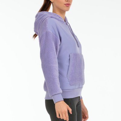 Sweat à capuche de notre ligne Winter. Confectionné en peau de mouton texturée au diamant de polyester, il comporte un devant en maille plate de polyester extensible. Il présente une poche kangourou et des poignets et un bas en rib.