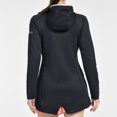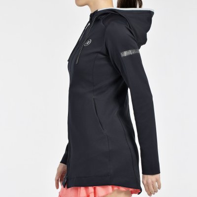 Sweat-shirt long à capuche de la ligne Proline, hautement technique en double piqué de polyester extensible. Silhouette cintrée, capuche avec cordons, fermeture zip sur le devant et découpes ergonomiques, poches latérales zippées.