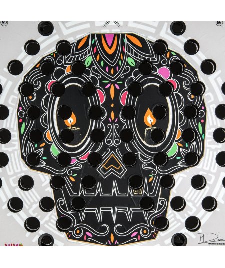 Son design est percutant : une calavera (crâne mexicain) occupe le centre de la composition sur une base blanche nacrée. Les détails aux couleurs vives — roses, verts, oranges et ors — créent un contraste vibrant qui reflète la joie, la couleur et la profondeur symbolique de cette fête emblématique. Des lignes ornementales évoquent les motifs de l'art populaire, ajoutant texture et dynamisme visuel à la raquette. Le grand logo Bullpadel s'intègre avec élégance, renforçant l'identité de la marque dans une proposition esthétique qui allie modernité, tradition et respect de la culture mexicaine. Comme marque distinctive de la collection, elle comprend la signature de Martín Di Nenno et la légende « VIVA MÉXICO », symbole de fierté et d'authenticité.