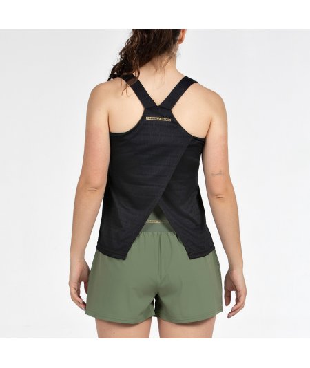 Technical tank top from the Premier Padel line. Designed for players seeking performance and style, this wide-strap tank top is made from custom jacquard fabric with a quick-drying finish that wicks away moisture and enhances breathability. Its design combines a V-neck with a crossover effect, a double back with an opening, and a right strap with a contrasting panel, adding a modern and dynamic touch without sacrificing comfort. Exclusive Premier Padel graphics complete a garment that reflects technology, femininity, and a competitive spirit both on and off the court.
