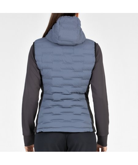 Gilet con cappuccio isolato e resistente all'acqua realizzato in costruzione sandwich bielastica 3D senza cuciture con finitura DWR senza PFC e fianchi in tessuto interlock di poliestere spazzolato con elastan. Presenta tasche laterali con cerniera e logo sul davanti.