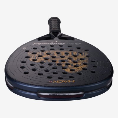 La struttura dell'HACK 04 è progettata per il posizionamento di un massimo di 5 pesi: 4 sulla parte superiore della racchetta e uno sul tappo inferiore, con un peso di 5 o 10 g. Grazie a tutto questo, possiamo creare specifiche diverse con un peso aggiuntivo fino a 22 g e uno spostamento del bilanciamento di ±1 cm.