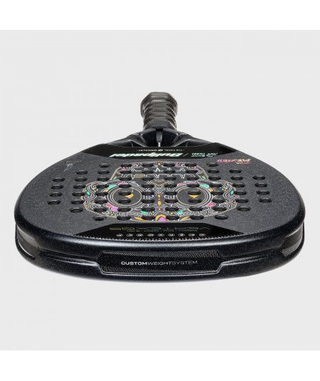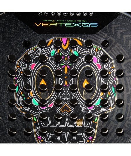 La superficie è definita da una base in tonalità scure che esalta i motivi geometrici e floreali ispirati all'architettura e all'arte tradizionale del Messico. Questo design crea un contrasto elegante con i dettagli in rosso e oro che irradiano energia e potenza in campo. La composizione riflette il carattere competitivo e tecnico di questa racchetta, pensata per giocatori che cercano la massima performance con un'identità visiva unica. Come sigillo finale della collezione, incorpora la firma di Juan Tello e la scritta “VIVA MÉXICO”, simboli dell'orgoglio nazionale e dello stretto legame tra Bullpadel e la comunità messicana del padel.